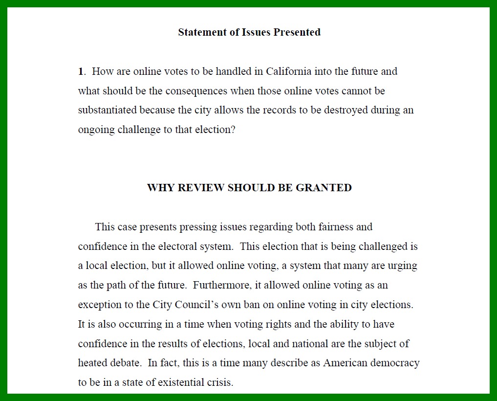 “From Petitioner’s research regarding California cases regarding the use of online voting or even challenges to an election involving online voting Petitioner is informed and believes this is a case of first impression.”